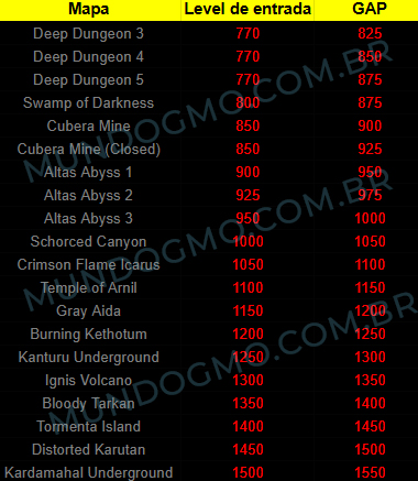 | Mapa | Level de entrada | GAP | GAP EliteZone |